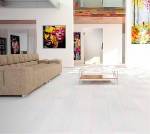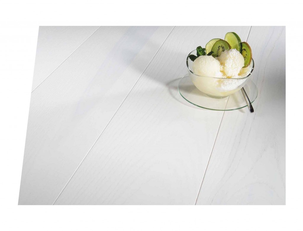 Ash wood in the frosty shade of lemon sorbet. Plain floorboard, covered with white matt lacquer. Clearly visible natural features of wood – accentuated by brushing and floorboard edges emphasized by bevelling..