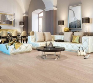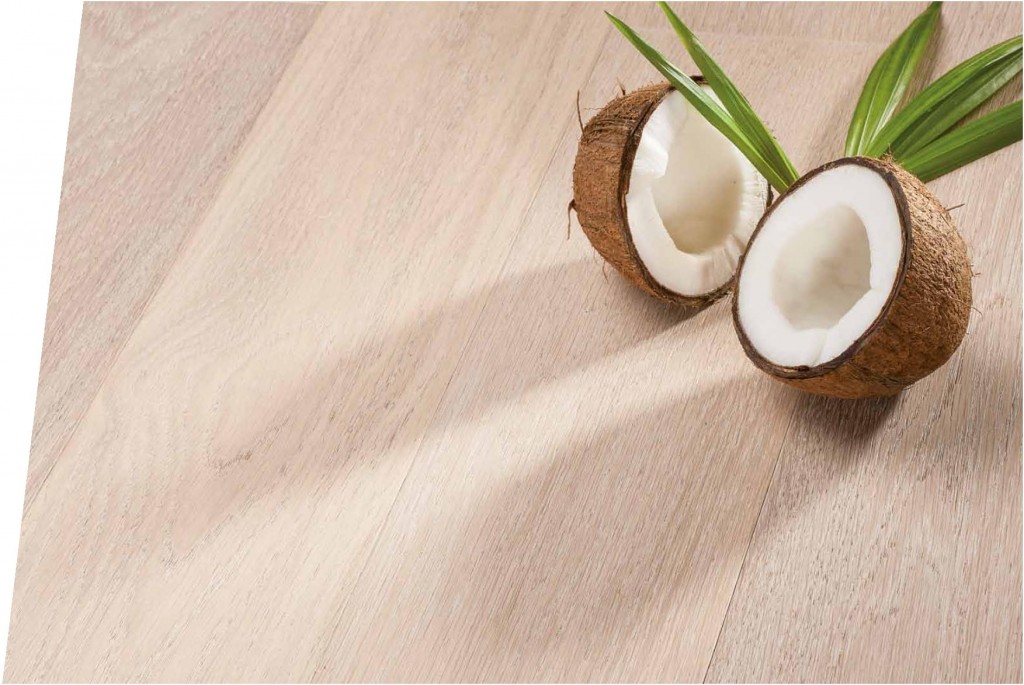 Subtle milky coconut coloured oak wood with delicate white streaks forming a natural pattern. The floor owes its original appearance to the brushing and bevelling processes which give it a slightly aged character.